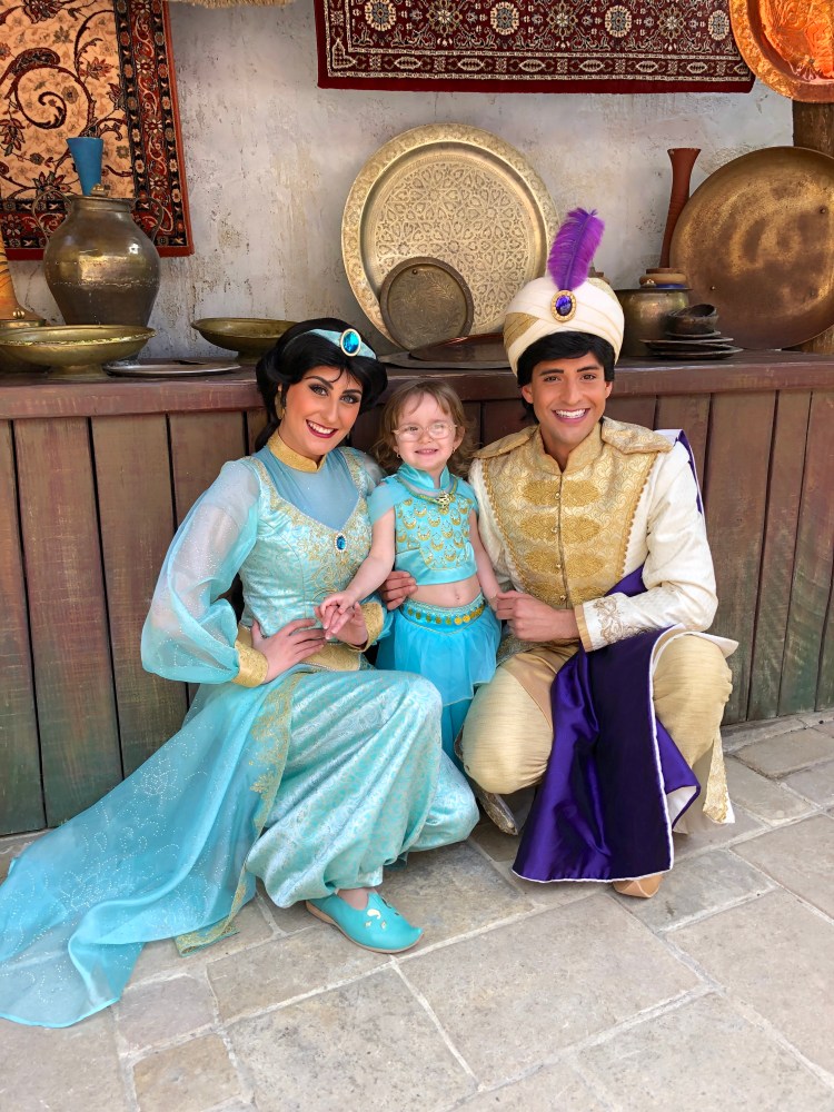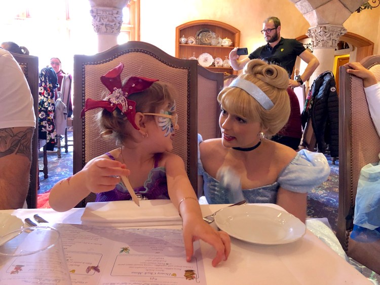 So here is what you need to know. Firstly decide on who you definitely want to meet. Ita had said she really wants to meet Jasmine. Truly, she didn’t stop going on about meeting Jasmine! The meet with Aladdin (and friends) is listed as being between 10-16.15 daily. When actually the meet for Aladdin and Jasmine is between 11.15 – 12 and then again at 1.15 – about 2.30. We tried to queue for this on our first day but the line was long and we had our princess lunch booked. Really, it’s the (and friends) who are around for longer periods. We got very lucky to accidently be in the right place at the right time to meet Genie so there were only about 10 people ahead and it was the same for Jafar. These characters you will find in the Agrabah area and you should be able to meet them quite easily without queuing for more than 20 mins. Therefore on our 3rd day we made a conscious effort to be at the front of the queue to meet Jasmine and Aladdin and it made Ita’s day.