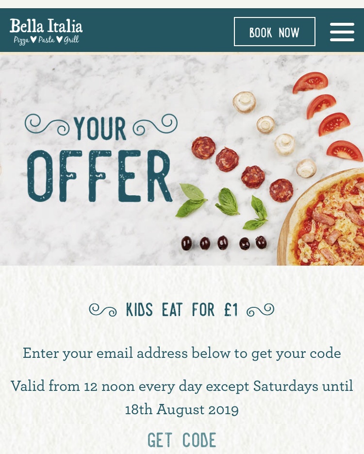 At Bella Italia, children can get a Piccolo or Grande meal for £1 when bought alongside a full-price adult main until noon on Sunday 18 August. (Sign up with your email address to get your coupon code).