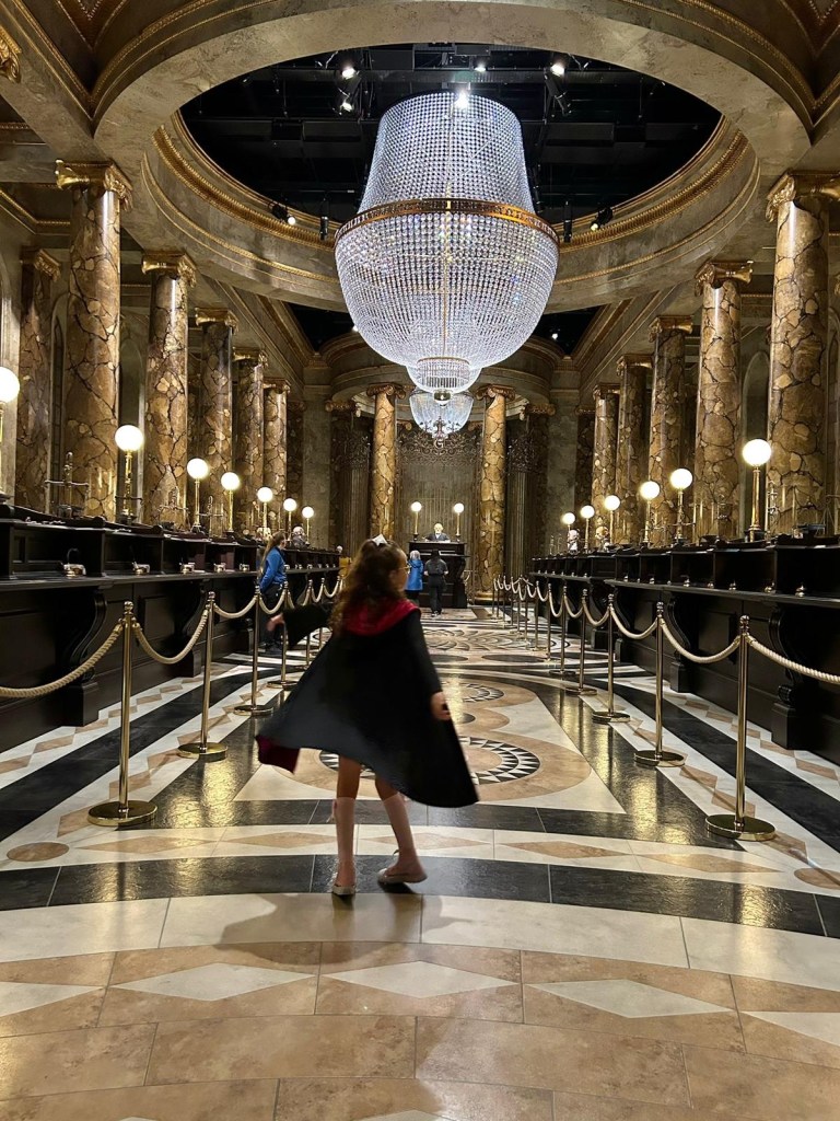 Another wow moment was when we entered the Gringotts Wizarding Bank set, the set is lined by towering marble pillars, and has 3 magnificent crystal chandeliers in the middle. There are so many hidden details with quills, ledgers and piles of Galleons, Sickles and Knuts and Goblins working as cashiers.